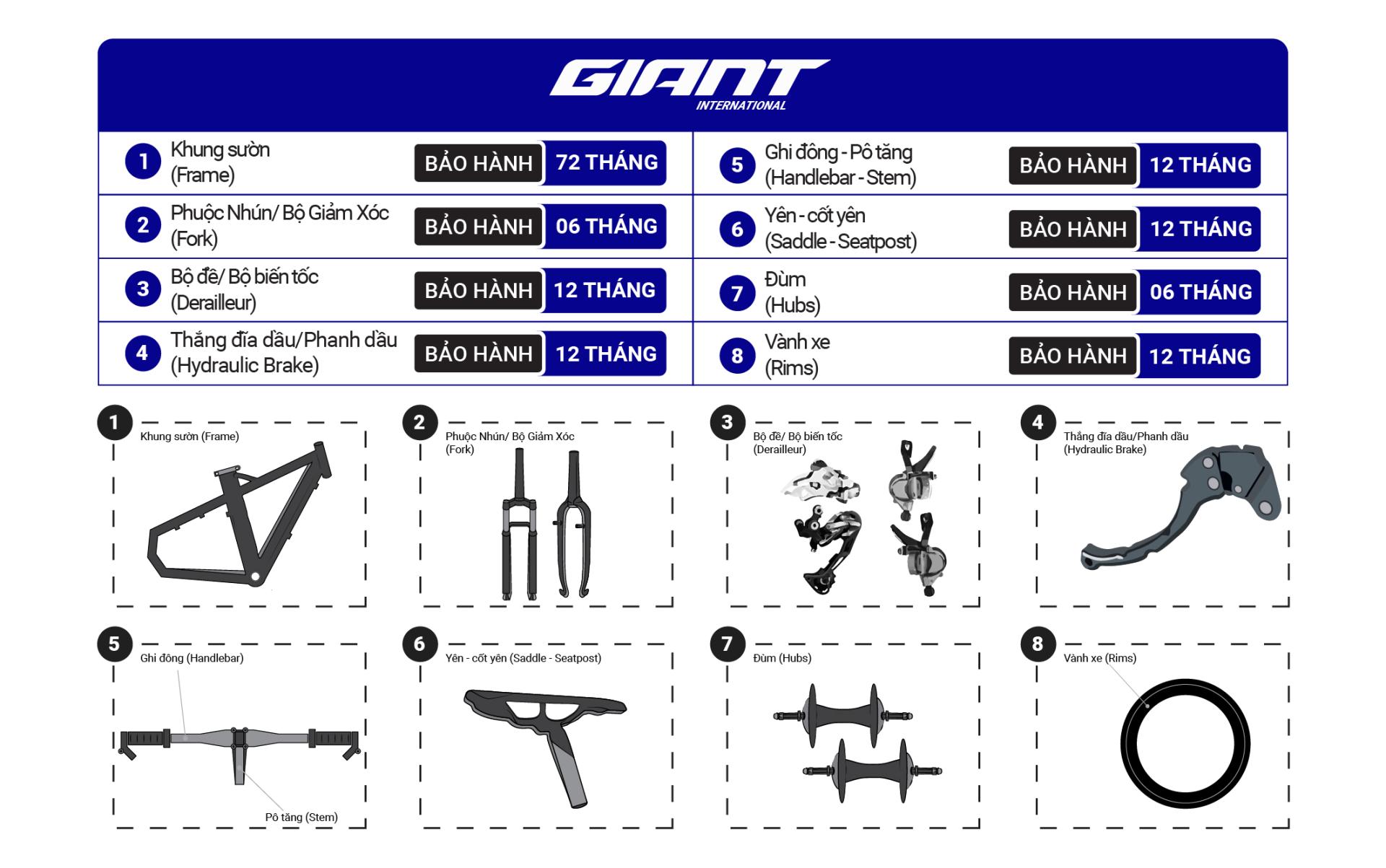 3. Các phụ tùng không thuộc thương hiệu Giant sẽ được bảo hành theo quy định của nhà máy sản xuất (SRAM, FOR, SHIMANO, DT-SWISS).